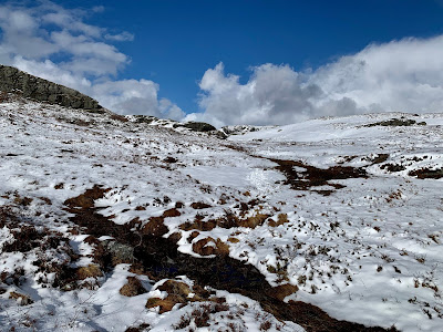 Det blåser godt fra nord i dag, men oppe i myrterrenget i Bekkeskaret får vi le for vinden. Snøen har dekket myrene, og i stien er det både vått og en del snø. Etterhvert gir vi opp å holde oss tørrskodd.