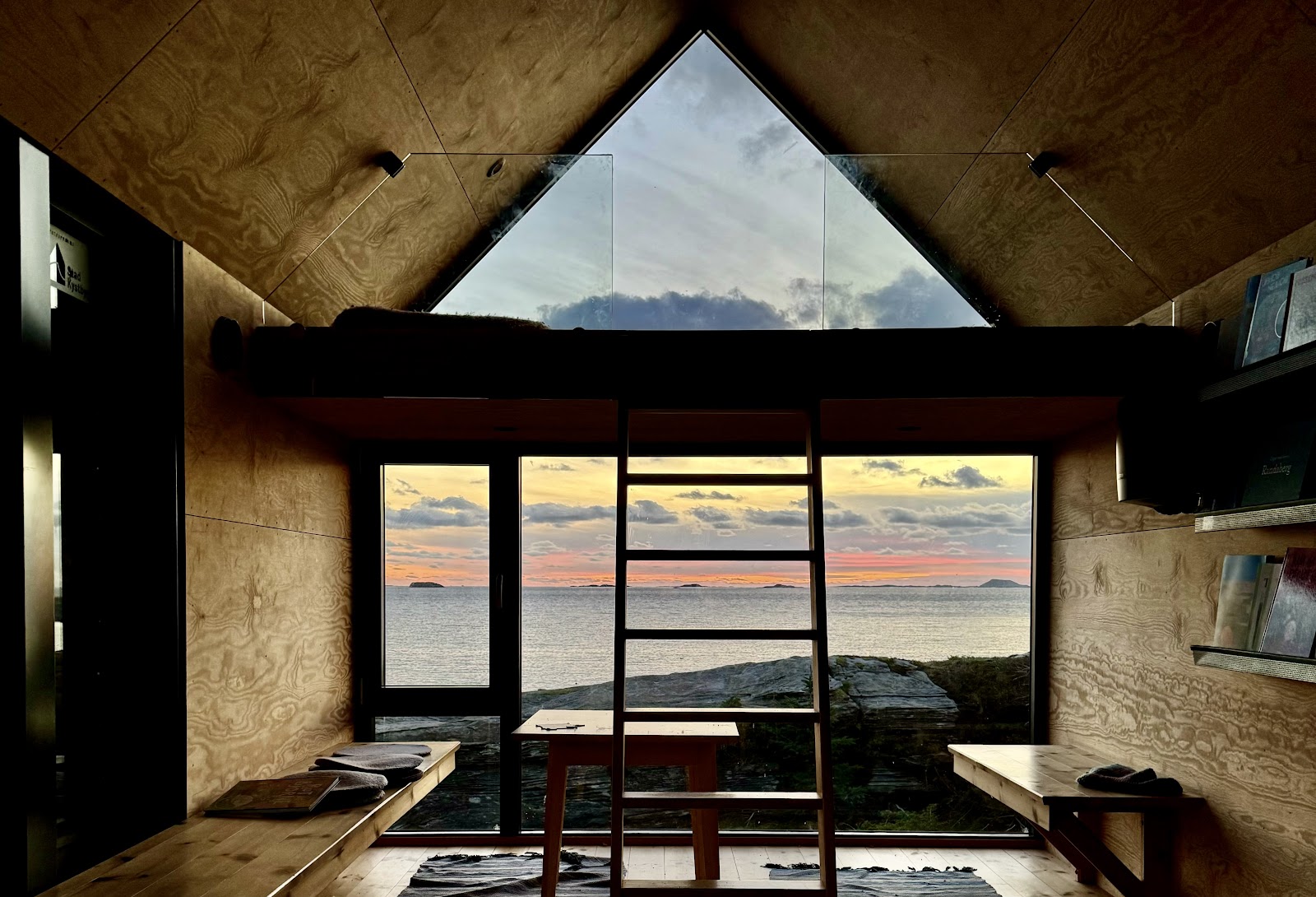 Vårt mål er dagsturhytta som er bygget ute på selve "Neset". Det er en kort spasertur på gruset tursti, tilpasset hjulbente og motoriserte helt inn til inngangsdøra. Vi bruker 10 minutter ut hit, så dette er en enkel utflukt. Ute i vest ligger Atlanteren og sluker sola.