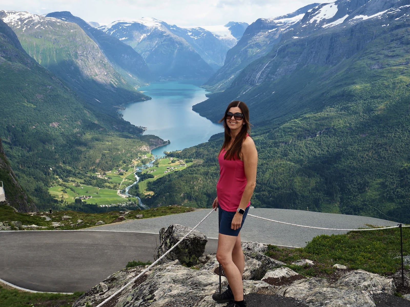 Vi tar snarveien med Loen Skylift opp til Hoven og setter igang med den korte toppturen. Allerede fra Hoven har vi spektakulær utsikt, og både fotomodell og fotograf er klar for en aldri så liten photosession.